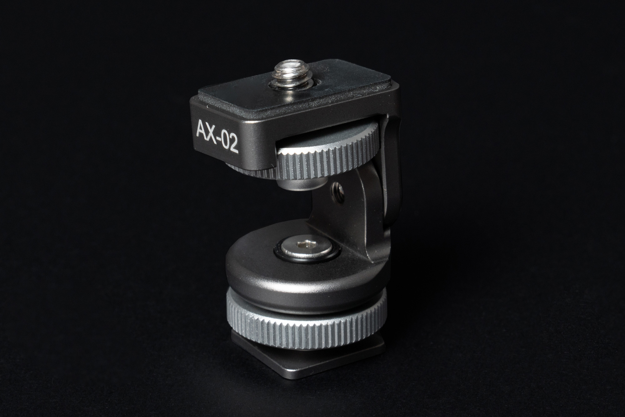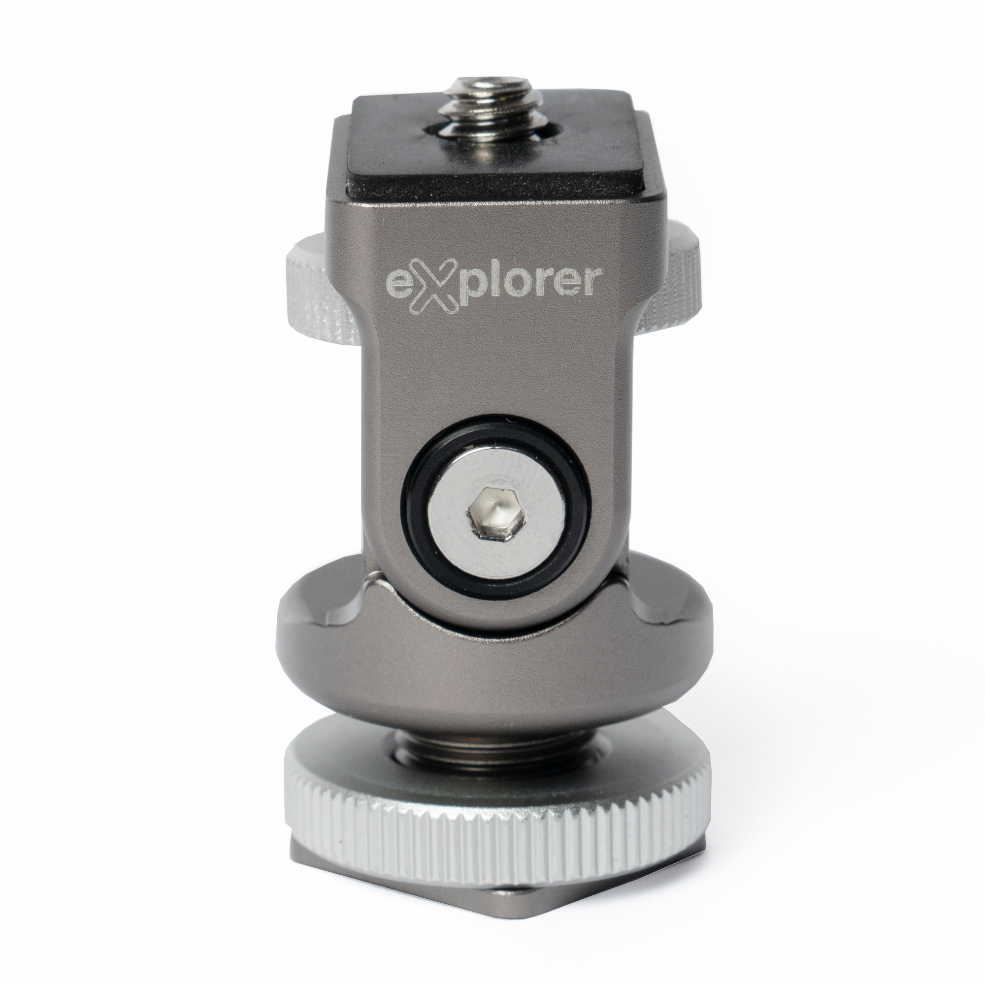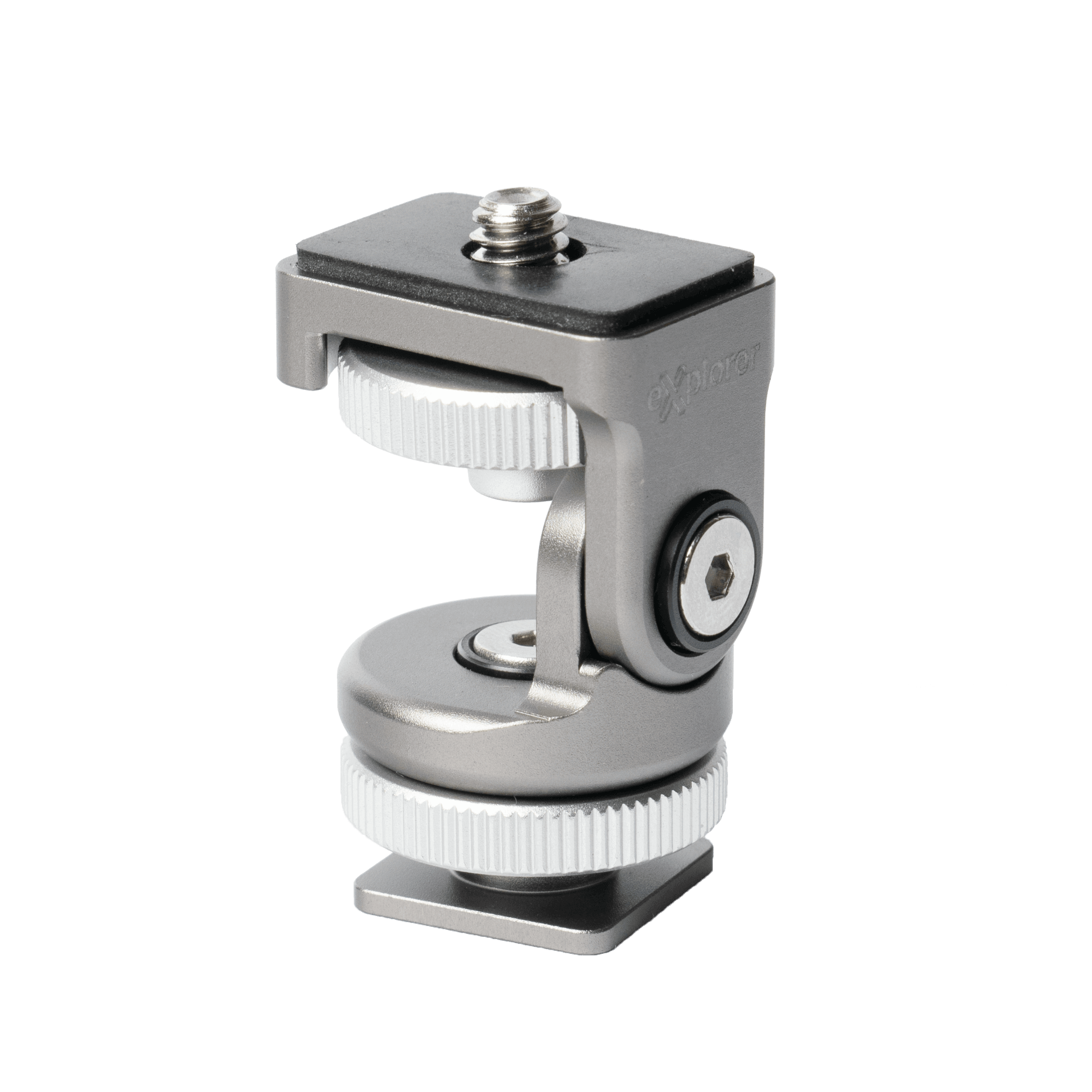 The Explorer AX-02 Aura Explorer Mini Tilt-Head is a shoe mount designed to be used with hot or cold shoes allowing accessories such as LED light panels, microphones, and more to be mounted to a camera, video setup, quick release plate, or a small tabletop tripod. The Explorer AX-02 Aura Explorer Mini Tilt-Head has a max load capacity of 2kg (4.4lbs) and includes a 1/4″ bottom mount crew thread in addition to the shoe mount. The AX-02 allows the mounted accessory to tilt up and down with friction adjustments made according to weight load with the included hex key wrench. The Explorer Mini Tilt-Head is very lightweight at only 36g and is made with a high-quality aluminum alloy construction with an anodized finish for durability.