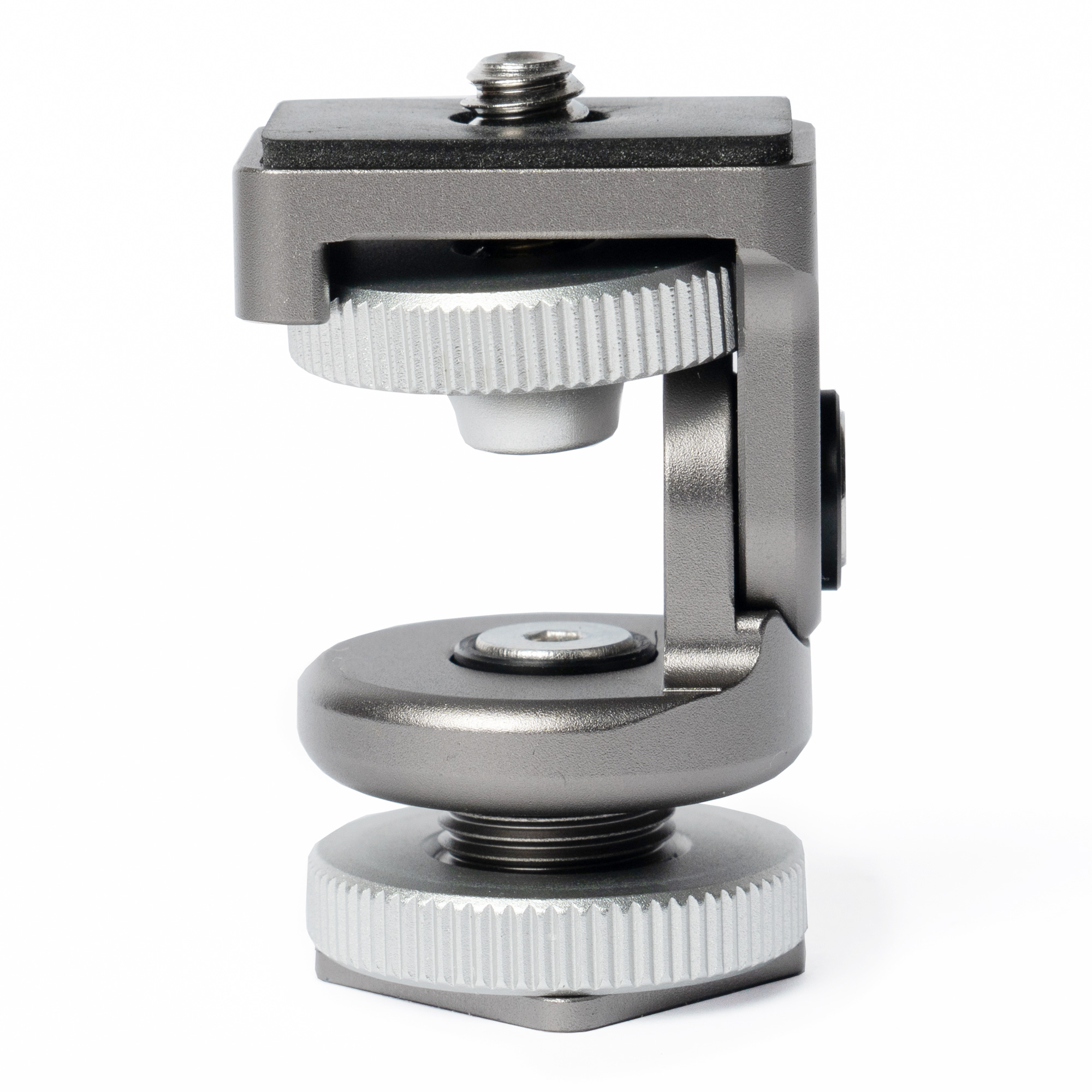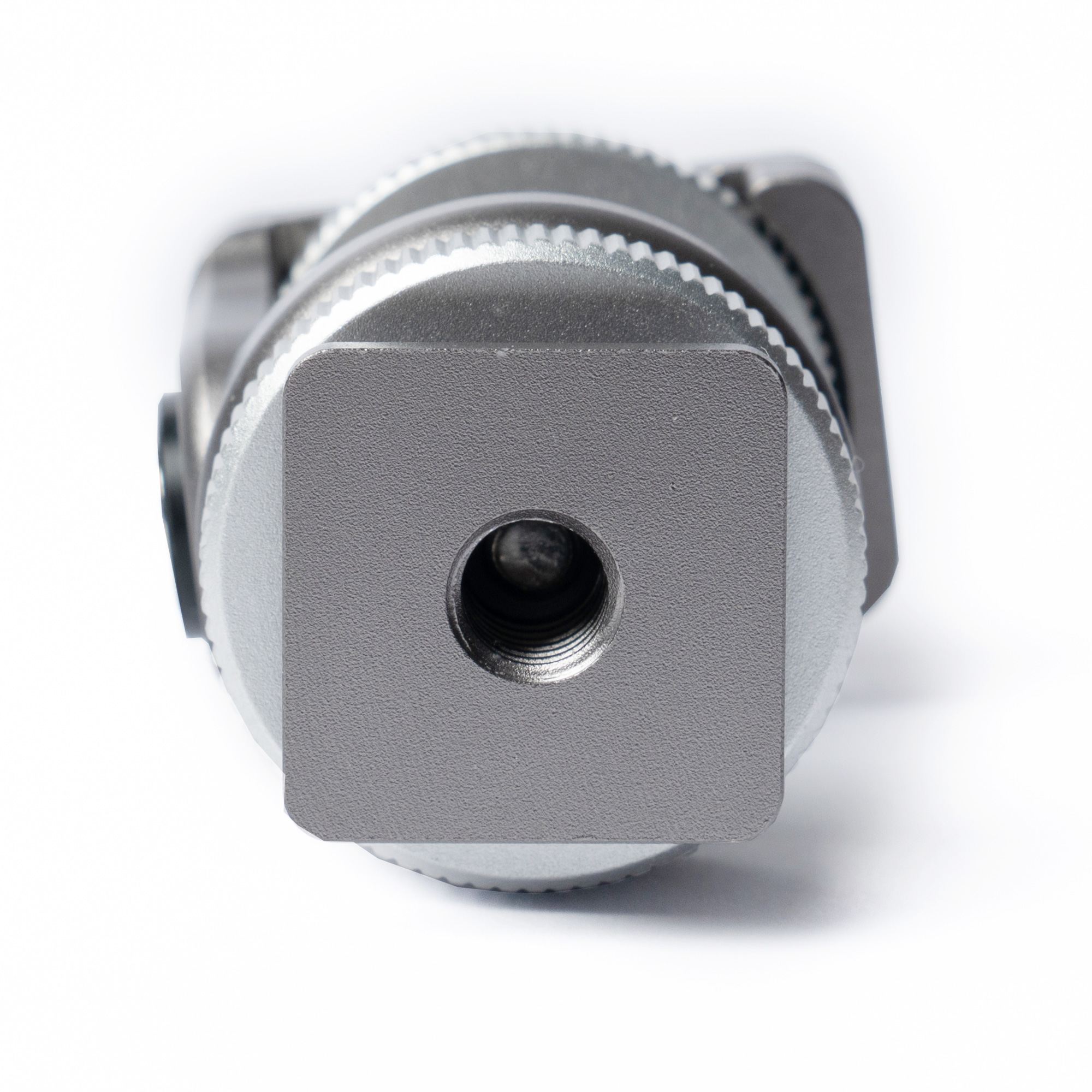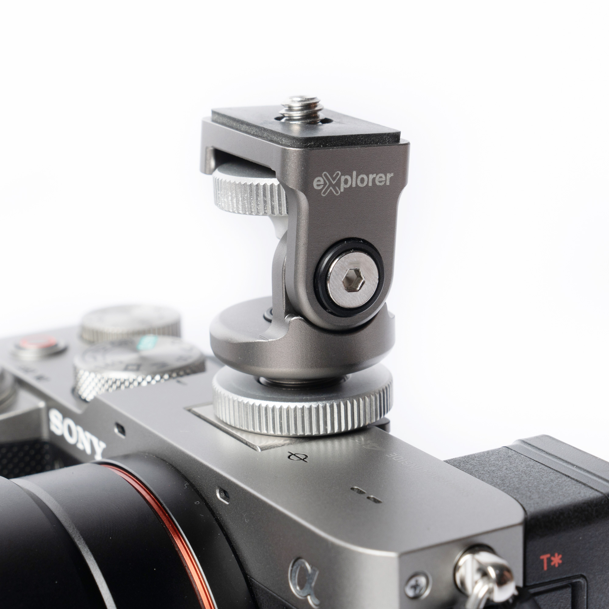 To attach to a camera, slide the foot into the hot shoe and tighten the silver lock. Use the top silver lock to mount the accessory and check the tilt dampening suits the accessory’s weight. Use the included hex key wrench to adjust damping according to load weight.