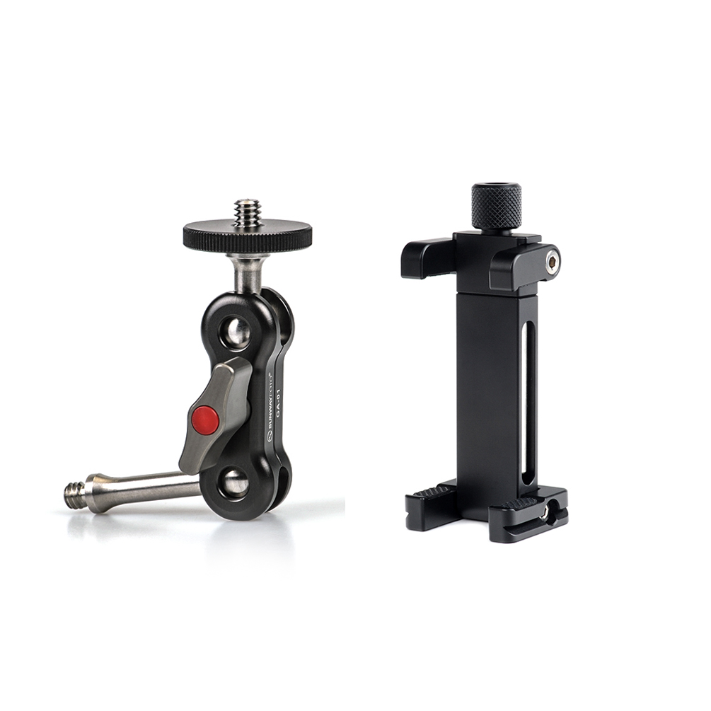 The Sunwayfoto GA-01 T1 Magic Arm + Mobile Phone Bracket is a great way to attach a mobile phone to any tripod or anything else with a 1/4″ accessory mounting point.