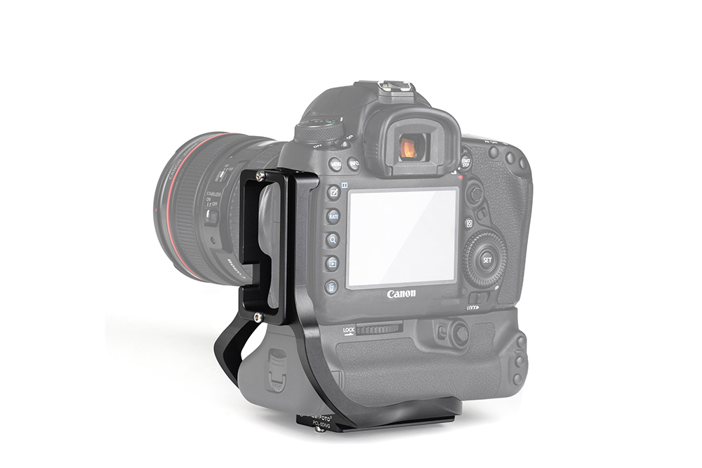 Sunwayfoto PCL-5DIVG Custom L Bracket for Canon 5D IV with Battery Grip is CNC-machined from solid aluminium alloy. The PCL-5DIVG L Bracket from Sunwayfoto enables reliable camera support for both horizontal and vertical shooting on a tripod or monopod. It is dedicated custom design for the Canon 5D IV DSLR with battery grip.
