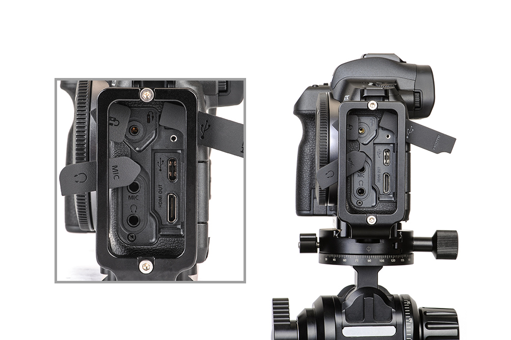 - The left side of the bracket features a gap to permit full access to all of the camera’s ports.